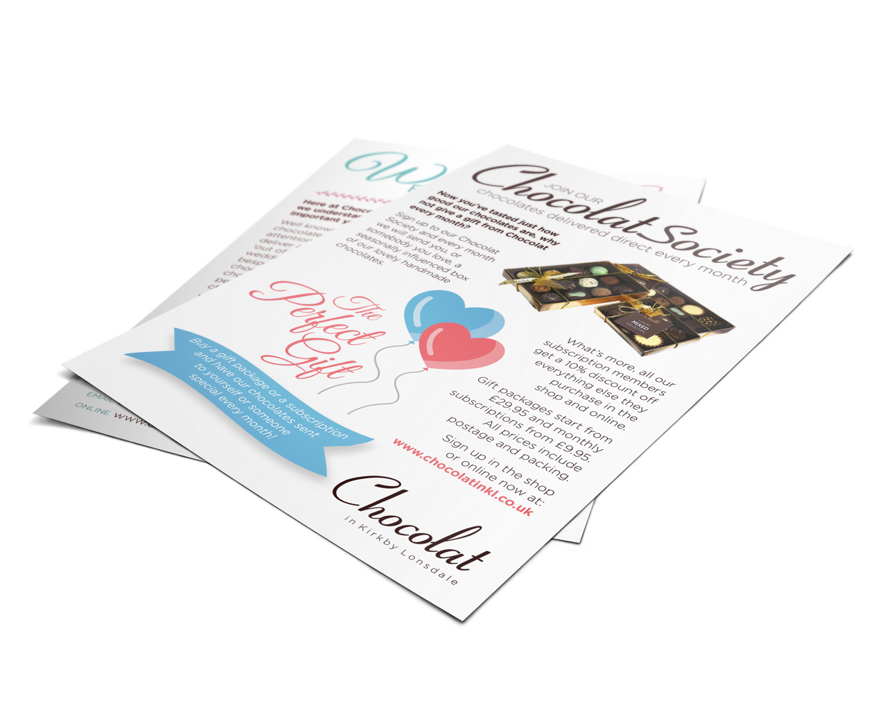 This flyer was designed for Chocolat in Kirkby Lonsdale when they launched a new monthly Chocolate Club.
